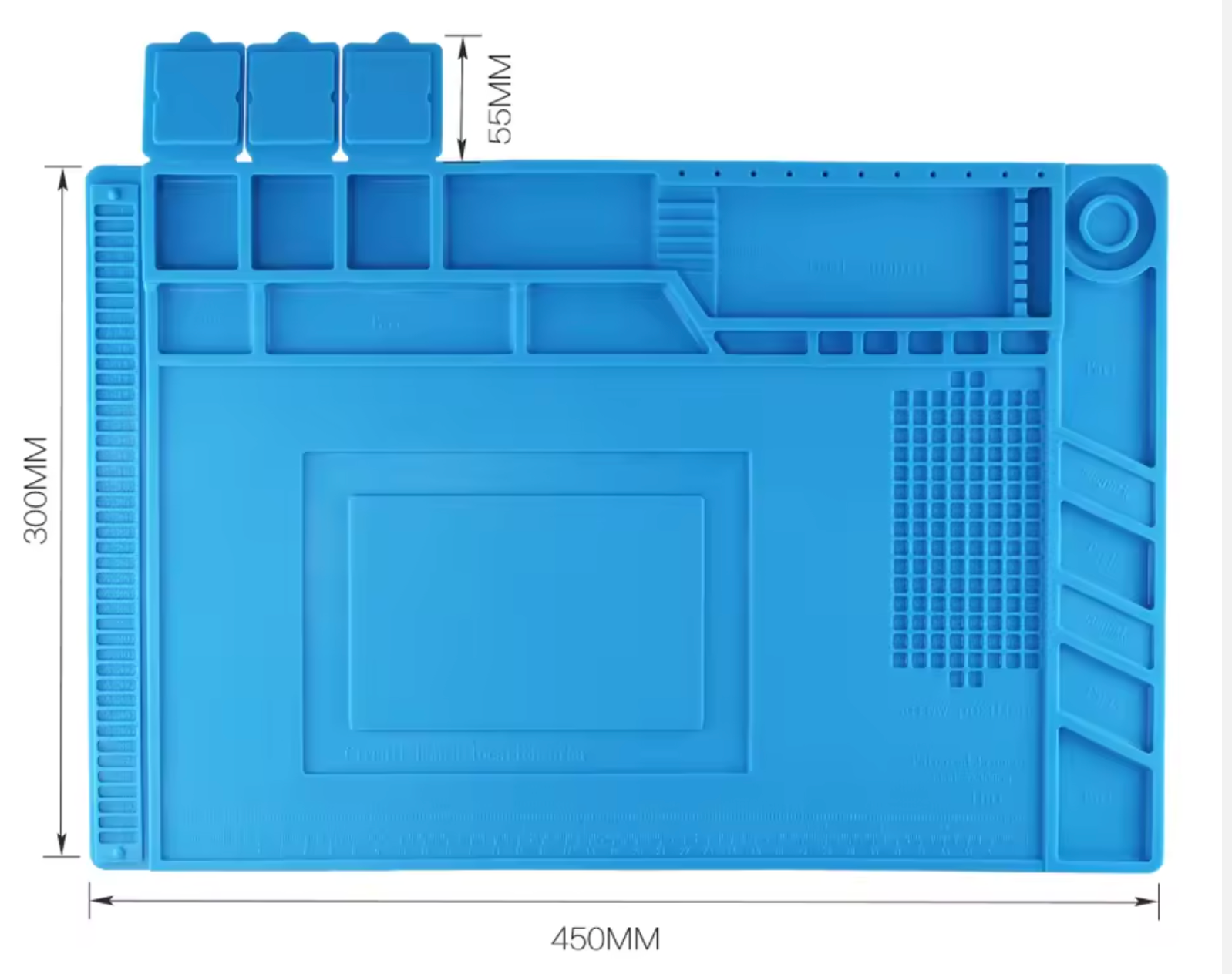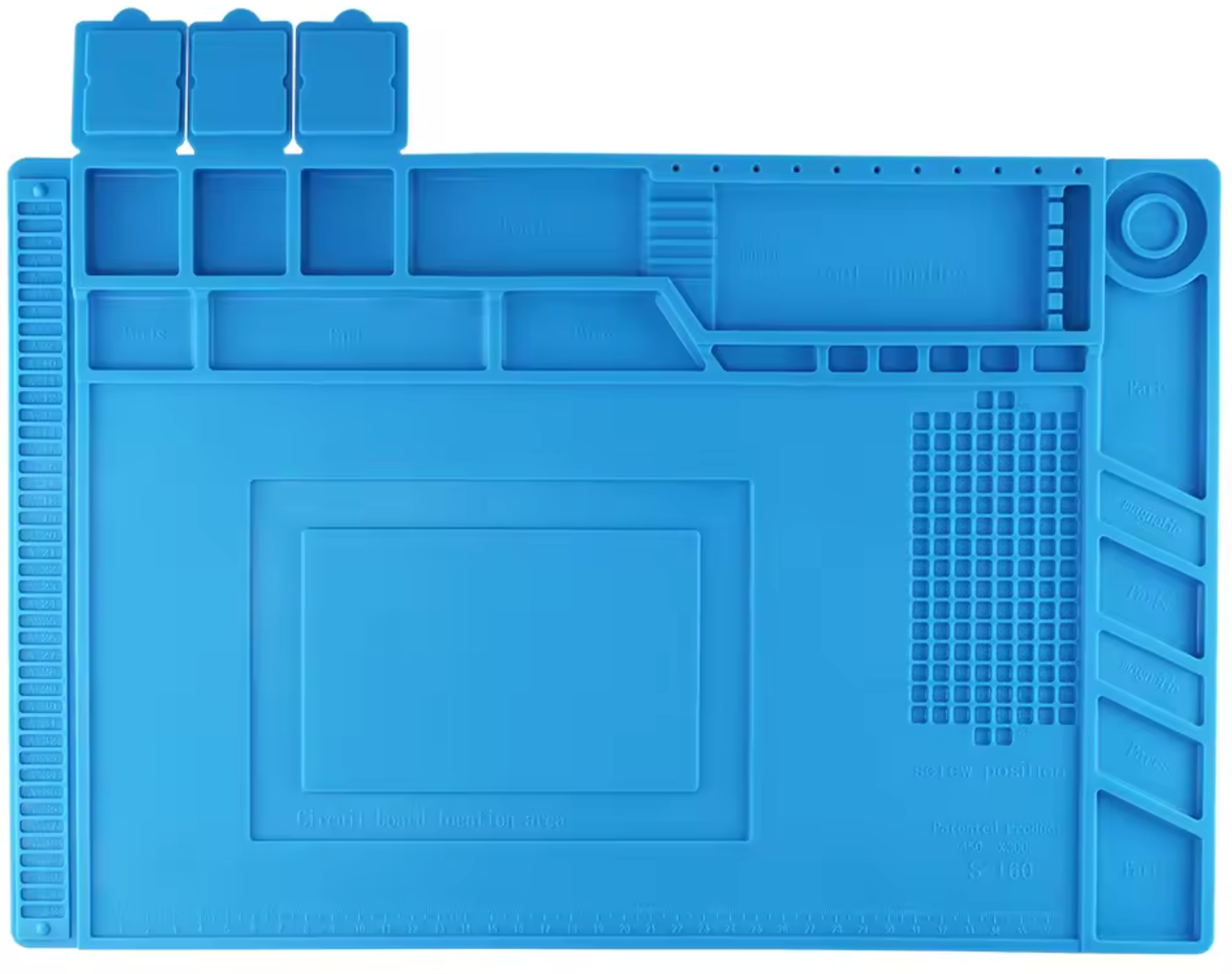 Hittebestendige mat met Siliconen Coating, Antistatisch met handige opbergvakjes zodat onderdelen niet wegrollen. Verschillende gat locaties voor het weg leggen van schroeven, ic's, chips en kleine onderdelen.